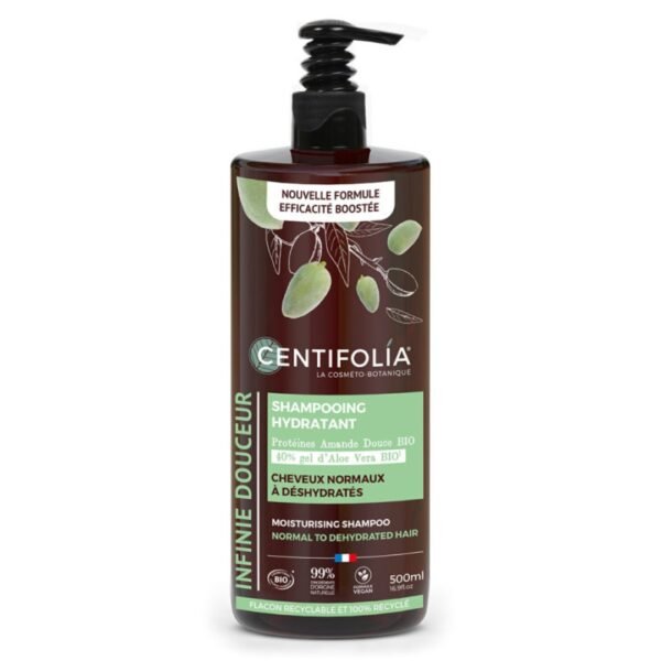 NOUVELLE FORMULE : plus sensorielle et agréable à utiliser, avec une efficacité boostée ! Adapté aux cheveux normaux à déshydratés, le shampooing hydratant Centifolia lave vos cheveux en douceur sans les agresser grâce à sa formule bio ultra-douce et sans sulfate*. Formulé pour délivrer les bienfaits d’actifs extrêmement puissants, il renferme : – 40% de gel d’ Aloe vera BIO , actif qui enrobe le cheveu en toute légèreté pour restaurer l’hydratation naturelle des cheveux. Reboostés, les cheveux retrouvent une douceur incomparable. – Les Protéines d’Amande douce qui facilitent le démêlage des cheveux et apportent de la douceur à vos cheveux. – La Kératine Végétale qui va préserver la structure interne du cheveu face aux agressions en limitant l’altération des protéines, constituant majeur de la fibre capillaire. Elle apporte un effet gainant et offre à votre chevelure douceur et légèreté. Fini les cheveux emmêlés et difficiles à coiffer. Désormais, il suffit d’une petite quantité de produit pour une mousse abondante, une application facile et un rinçage rapide. Des cheveux doux sans compromis. Notre Shampoing hydratant est formulé avec un parfum 100% naturel ! Un parfum 100% naturel est un parfum fabriqué uniquement à partir d’ingrédients naturels, extraits de plantes, de fleurs, de fruits, ou d’autres sources naturelles. Ces parfums sont souvent appréciés par ceux qui préfèrent des produits plus respectueux de l’environnement et qui évitent les produits chimiques potentiellement irritants et polluant. Pour plus de douceur, découvrez votre nouvelle routine capillaire Centifolia : INFINIE DOUCEUR Conçu et fabriqué en France. *Sans tensioactifs sulfatés Formule vegan : sans ingrédients d’origine animale ou dérivés.