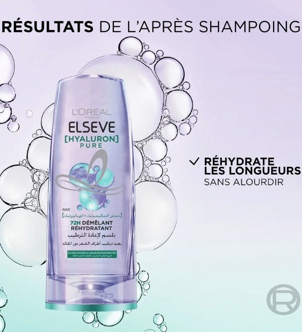 Elseve Hyaluron Repulp Après Shampoing Démêlant Hydratation 72H 200 ml est conçu pour les cheveux déshydratés et fatigués Enrichi en Acide Hyaluronique Pur, il démêle instantanément sans alourdir, tout en scellant l’hydratation jusqu’à 72h Grâce à sa capacité à retenir jusqu’à 1000 fois son poids en eau, l’acide hyaluronique repulpe la fibre capillaire et restaure la brillance naturelle des cheveux Il rend vos cheveux plus hydratés, visiblement plus souples, doux et rayonnants de santé. Fabriqué en France Conseil d’utilisation Appliquez sur cheveux mouillés Laisser poser 1 minutes puis rincez En cas de contact avec les yeux, rincer immédiatement et abondamment Composition AQUA / WATER, CETEARYL ALCOHOL, DIMETHICONE, GLYCERIN, BEHENTRIMONIUM CHLORIDE, CI 17200 / RED 33, CI 42090 / BLUE 1, LACTIC ACID, SODIUM LAURETH SULFATE, SODIUM HYDROXIDE, SODIUM HYALURONATE, PHENOXYETHANOL, LIMONENE, AMODIMETHICONE, ISOPROPYL ALCOHOL, CETRIMONIUM CHLORIDE, PARFUM / FRAGRANCE.