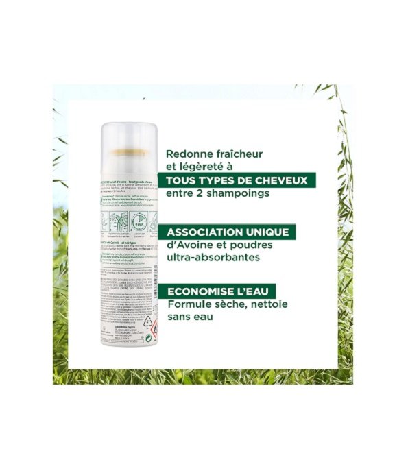 . Élaboré à partir de lait d’Avoine adoucissant et de poudres d’origine naturelle à très haut pouvoir absorbant, ce Shampoing sec nettoie en douceur, sans agresser. Utilisé entre 2 shampoings et vaporisé sur cheveux secs, il redonne volume, fraîcheur et texture aux cheveux dans un délicat parfum. Son format spray offre une application facile et ne laisse pas de résidus. Bienfaits : « – Nettoyant : la formule extra-douce sans rinçage au lait d’Avoine assainit le cuir chevelu sans agresser et élimine l’excès de sébum en 2 minutes. – Texturisant : en quelques vaporisations, il redonne volume, matière et texture aux cheveux sans avoir besoin de les mouiller. – Coiffant : véritable geste fraîcheur et secret de beauté, le Shampoing sec Avoine facilite la réalisation de toutes les coiffures et favorise leur tenue. » Conseils d’utilisations: 1 . AGITERAgiter le spray avant emploi. 2 . VAPORISERVaporiser raie par raie à 15 cm du cuir chevelu et laisser agir 2 min. 3 . ELIMINERBien brosser ou utiliser un sèche-cheveux pour éliminer les résidus. ingredients : BUTANE. PROPANE. ORYZA SATIVA (RICE) STARCH (ORYZASATIVA STARCH). ISOBUTANE. ALCOHOL (ALCOHOL DENAT). ALUMINUM STARCH OCTENYLSUCCINATE. AVENA SATIVA (OAT) KERNEL OIL (AVENA SATIVA KERNEL OIL). CETRIMONIUM CHLORIDE. CYCLODEXTRIN. FRAGRANCE (PARFUM). ISOPROPYL MYRISTATE. SILICA