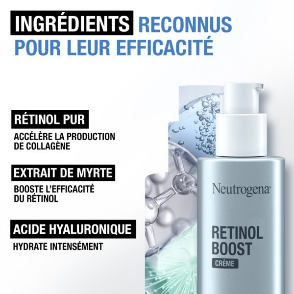 Neutrogena Retinol Boost Crème Visage Anti-Âge Anti-Rides 50ml Neutrogena | Crème Anti-Âge Retinol Boost La crème anti-âge Neutrogena Retinol Boost à absorption rapide combat les signes visibles du vieillissement de la peau : rides, peau fatiguée, sécheresse et taches pigmentaires. Sa formule Retinol Boost contient du rétinol pur, une forme de vitamine A prouvé scientifiquement comme accélérateur de la production de collagène et du renouvellement cellulaire à la surface de la peau. Le rétinol de ce soin du visage est associé à de l’extrait végétal de myrte pour booster son efficacité et à de l’acide hyaluronique pour une hydratation intense. Conseils d’utilisation : Une fois par jour, appliquer 2 doses de crème sur la paume de la main et masser doucement le visage et le cou. Ingrédients Aqua, Pentaerythrityl Tetraethylhexanoate, Dimethicone, Glycerin, PPG-15 Stearyl Ether, Stearyl Alcohol, Cetearyl Alcohol, Butylene Glycol, Ceteareth-20, Isohexadecane, Retinol, Hydrolyzed Myrtus Communis Leaf Extract, Caprylic/Capric Triglyceride, Ethylhexylglycerin, Sodium Hyaluronate, Caprylyl Glycol, Polyacrylamide, Cellulose, C13-14 Isoparaffin, Laureth-7, Dimethicone Crosspolymer, Ammonium Acryloyldimethyltaurate/VP Copolymer, Disodium EDTA, Sodium Hydroxide, BHT, Ascorbic Acid, Phenoxyethanol, Chlorphenesin, Parfum.