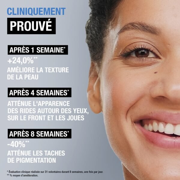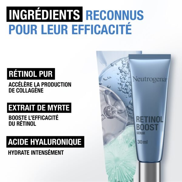 Neutrogena Retinol Boost Sérum Visage Anti-Âge Anti-Rides 30ml Neutrogena | Sérum Retinol Boost Ce sérum à la texture légère et soyeuse libère du rétinol pur à la surface de la peau et combat efficacement les signes visibles de l’âge pour une peau à l’aspect net et plus jeune. Si efficace que 100 % des testeurs ont constaté un résultat visible après 1 semaine*. *Évaluation clinique réalisée sur 31 volontaires durant 8 semaines, une fois par jour INGRÉDIENTS RECONNUS POUR LEURS EFFICACITÉ • Le rétinol pur, une forme de vitamine A reconnue par les dermatologues, est prouvé scientifiquement comme accélérateur de la production de collagène et stimulant du renouvellement cellulaire à la surface de la peau. • De l’extrait végétal de myrte pour booster l’efficacité du rétinol. • De l’acide hyaluronique pour aider à hydrater la peau. Application : Une fois par jour, appliquer 2 pompes de sérum dans la paume de la main et masser délicatement le visage et le cou. Pour les nouveaux utilisateurs de rétinol : Il est important d’introduire le rétinol progressivement dans votre routine de soins de la peau.Pendant les 3 premières semaines, appliquer 2 à 3 fois par semaine. Passer à une application quotidienne si votre peau le tolère. Éviter tout contact avec les yeux. IMPORTANT : Une rougeur, sensation de chaleur, de picotement ou une desquamation peuvent apparaître. Ces signes sont normaux, temporaires et indiquent que la formule fait effet. Si ces effets sont source d’inconfort, réduire la fréquence d’utilisation jusqu’à ce que la peau s’adapte. Si les effets persistent, cesser d’utiliser le produit. Comment l’utiliser Une fois par jour, appliquer 2 pompes de sérum dans la paume de la main et masser délicatement le visage et le cou.