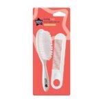 Tommee Tippee Ensemble Brosse et Peigne L’ensemble brosse et peigne pour bébé est doux et a été spécialement conçu pour être utilisé avec les cheveux et la peau délicats de bébé. Notre brosse pour bébé a des poils doux pour réduire les cheveux tirés et emmêlés, tandis que le peigne pour bébé anti-rayures offre un contrôle supplémentaire sans sacrifier le confort , idéal pour une utilisation avec la peau et les cheveux de bébé les plus délicats. L’ensemble brosse et peigne pour bébé Tommee Tippee dès la naissance et est sans BPA. Il fait partie de la gamme Essential Basics qui comprend des ciseaux pour bébé et un coupe-ongles. Brosse à poils doux pour réduire les tiraillements et l’inconfort lors du brossage. Peigne bébé anti-rayures pour cuir chevelu délicat. Manche de brosse facile à tenir. Sans BPA. L’emballage peut varier.