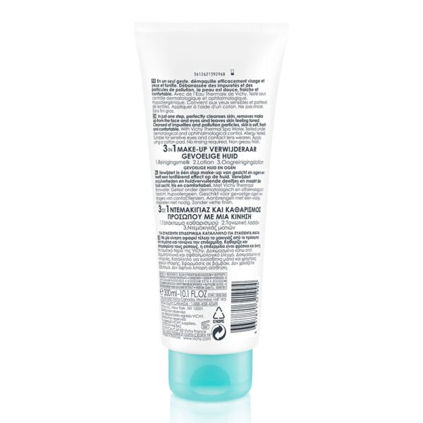 Caractéristiques : Polyvalent, ce soin démaquillant 3 en 1 nettoie la peau en douceur sans l’étouffer grâce à ses nombreux bienfaits : Lait-gel nettoyant : cette texture de lait-gel, qui offre à la peau douceur et fraîcheur, permette un nettoyage doux et rapide sans l’agresser. Après le démaquillage, l’épiderme est hydraté et apaisé. Lotion rafraîchissante : grâce à cette texture gel, la peau est tonifiée instantanément et rafraîchie en raison des actifs rafraîchissants qui composent le soin démaquillant. De plus, légère et riche à la fois, cette lotion laisse la peau confortable, sans déposer de film gras. Démaquillant yeux : parce que les yeux sont extrêmement sensibles et fragiles, il est important de les démaquiller avec soin à l’aide d’une lotion adéquate. Pour les porteurs de lentilles de contact, il est également essentiel de veiller à nettoyer délicatement les yeux, souvent plus secs et fragiles. Formulé spécifiquement pour démaquiller les yeux sensibles, le démaquillant 3en1 garantit un nettoyage confort sans piquer les yeux. Sécurité : – Hypoallergénique. – Sans Parabène. – Testé sous contrôles dermatologique et ophtalmologique. – Convient aux porteuses de lentilles. Ingrédients & Principes Actifs Clés : Grâce à sa formulation en Captelae, un actif anti-pollution extrait du karité, la peau est purifiée et nettoyée en douceur de toutes ses impuretés, ainsi que des particules de pollution : elle respire à nouveau. Résultat : un visage frais, confortable et doux. Conseils d’Utilisation : Le matin et le soir, déposez une noisette de démaquillant Vichy 3 en 1 sur un coton à appliquer sur l’ensemble du visage, ainsi que sur les yeux. Ne rincez pas le produit. Efficacité : Laisse la peau fraîche : 93%. Laisse la peau confortable : 93%. Ne pique pas les yeux : 100%. Auto-évaluations. 22 sujets Composition : Les listes d’ingrédients entrant dans la composition des produits de notre marque sont régulièrement mises à jour. Avant d’utiliser un produit de notre marque, vous êtes invités à lire la liste d’ingrédients figurant sur son emballage afin de vous assurer que les ingrédients sont adaptés à votre utilisation personnelle. AQUA – PARAFFINUM LIQUIDUM – ISOPROPYL MYRISTATE – POTASSIUM PHOSPHATE – CARBOMER – SODIUM HYDROXIDE – DIPOTASSIUM PHOSPHATE – DISODIUM EDTA – DISODIUM COCOAMPHODIACETATE – MYRTRIMONIUM BROMIDE – BUTYLENE GLYCOL – BUTYROSPERMUM PARKII SEEDCAKE EXTRACT – PARFUM.