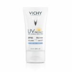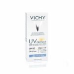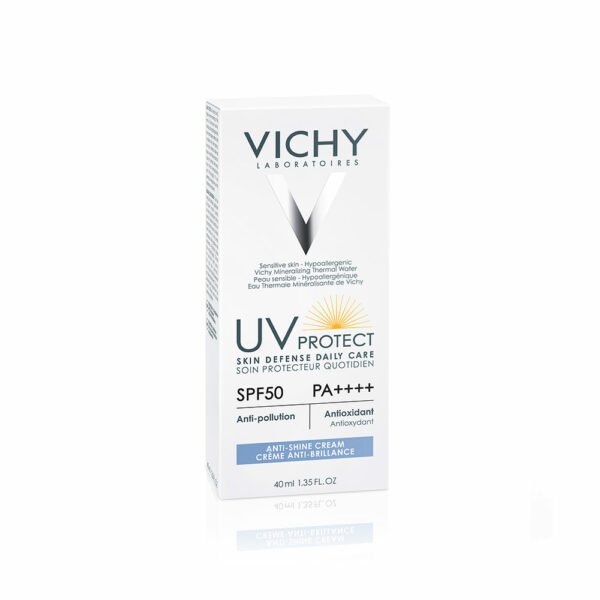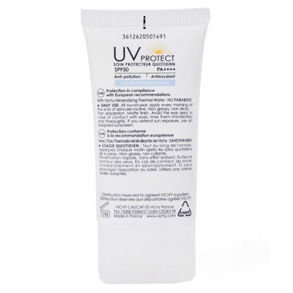 Caractéristiques : La crème hydratante invisible SPF50 anti-UV est la première crème hydratante de Vichy qui vous protège contre les rayons UV pendant toute l’année et empêche l’apparition de taches brunes. Sa formule contient l’extrait de la baicaline et est enrichie d’antioxydants dont la peau a besoin pour se protéger. – Hydrate la peau immédiatement. – Prévient contre les taches brunes. – Prorège contre les rayons UV. – Écran solaire, non huileux, non collant. Sécurité : – Hypoallergénique. – Sans Parabène. – Testé sur peaux sensibles sous contrôle dermatologique. Ingrédients & Principes Actifs Clés : Un extrait de Graines de Karité d’origine végétale combiné à deux antioxydants, à savoir, l’Extrait de Racine de Baicaline de Chine et la Vitamine E, pour vous aider à empêcher l’oxydation de la peau causée par la pollution. Conseils d’Utilisation : Appliquer la crème hydratante invisible SPF50 anti-UV tous les matins après votre routine quotidienne. Ne laisse pas de film gras. Ne laisse pas la peau collante. Finition Mat. Absorption rapide. Eviter le contour des yeux. En cas de contact avec les yeux, rincez-les immédiatement et soigneusement. Si l’exposition au soleil est prolongée, l’utilisation d’un écran solaire adapté est souhaitable. Composition : Les listes d’ingrédients entrant dans la composition des produits de notre marque sont régulièrement mises à jour. Avant d’utiliser un produit de notre marque, vous êtes invités à lire la liste d’ingrédients figurant sur son emballage afin de vous assurer que les ingrédients sont adaptés à votre utilisation personnelle. AQUA / WATER – ETHYLHEXYL METHOXYCINNAMATE – DIMETHICONE – GLYCERIN – DROMETRIZOLE TRISILOXANE – TEREPHTHALYLIDENE DICAMPHOR SULFONIC ACID – PROPYLENE GLYCOL – TITANIUM DIOXIDE – ALCOHOL DENAT. – TRIETHANOLAMINE – STEARIC ACID – BIS-ETHYLHEXYLOXYPHENOL METHOXYPHENYL TRIAZINE – POTASSIUM CETYL PHOSPHATE – TOCOPHEROL – NYLON-12 – ACRYLAMIDE/SODIUM ACRYLOYL DIMETHYLTAURATE COPOLYMER – ALUMINUM HYDROXIDE – BHT – BUTYLENE GLYCOL – BUTYROSPERMUM PARKII SEEDCAKE EXTRACT / SHEA SEEDCAKE EXTRACT – CAPRYLYL GLYCOL – CARBOMER – CETYL ALCOHOL – CI 14700/ RED4 – CITRIC ACID – DIETHYLAMINO HYDROXYBENZOYL HEXYL BENZOATE – DISODIUM EDTA – GLYCERYL STEARATE – ISOHEXADECANE – MYRISTIC ACID – PALMITIC ACID – PEG-100 STEARATE – PHENOXYETHANOL – POLYSORBATE 80 – SCUTELLARIA BAICALENSIS EXTRACT / SCUTELLARIA BAICALENSIS ROOT EXTRACT – SODIUM CHLORIDE – SODIUM COCOYL SARCOSINATE – SORBITAN OLEATE – XANTHAN GUM – PARFUM / FRAGRANCE.